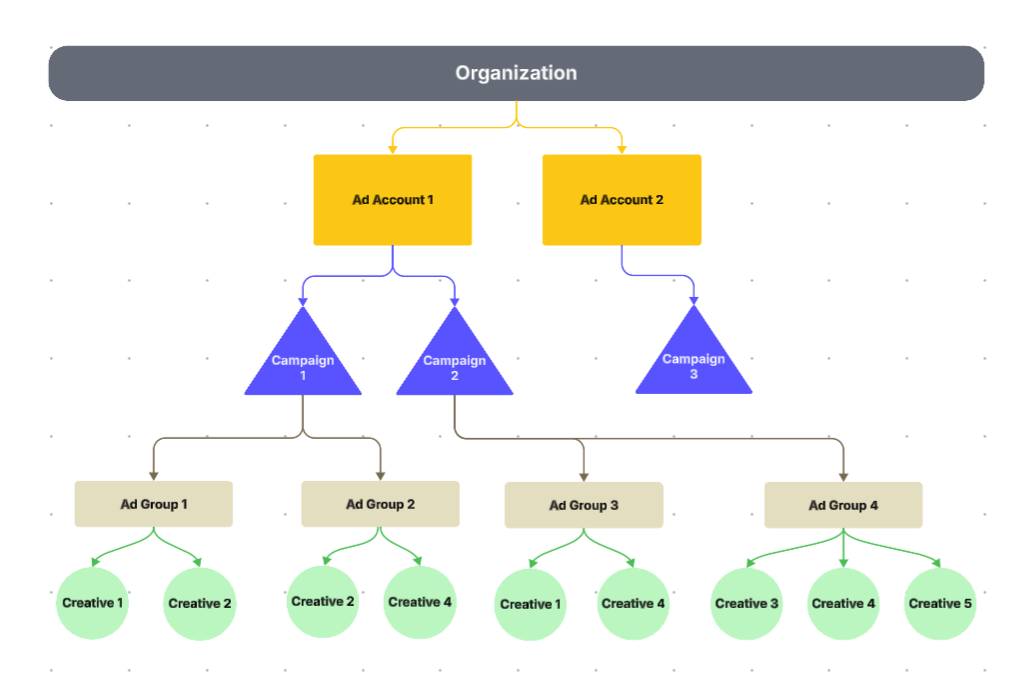 The highest-level object, an organization typically corresponds to a business entity, like an advertiser or ad agency, or can be created by an API partners that wants to create an app with Roku. An organization contains everything you need to run an ad with Roku, including your ad accounts, campaigns, ad groups, and creatives.